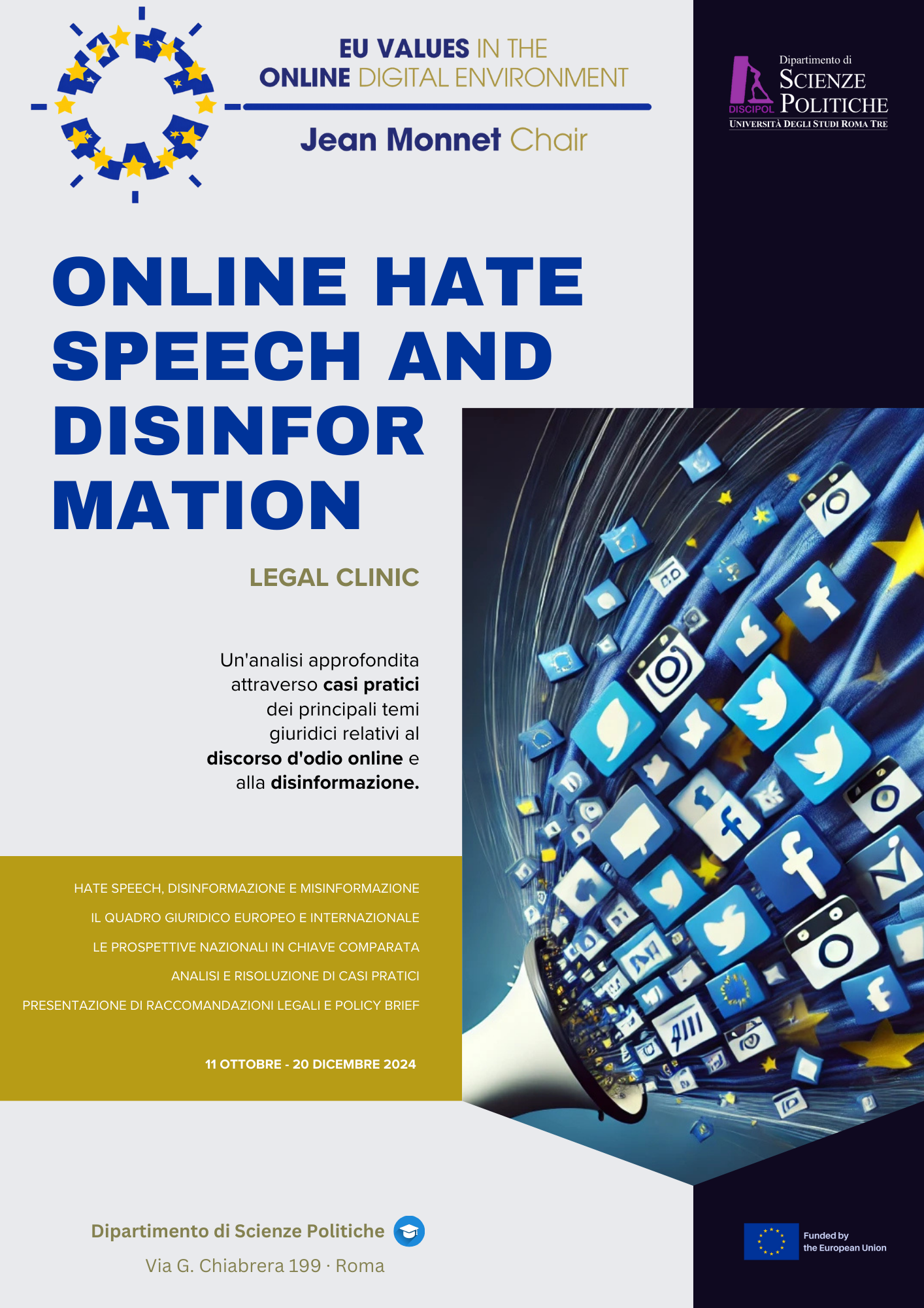 Hate Speech e disinformazione online Durata: 18 ore Clinica legale per studenti universitariPoster (2024/25) Prof. Claudio Di Maio Stato di diritto e ambiente digitale Durata: 18 ore Clinica legale per studenti universitari Poster (2024/25) Prof. Alessandro Nato Stato di diritto e ambiente digitale Durata: 18 ore Stato di diritto e ambiente digitale Prof. : Alessandro Nato Hate Speech e disinformazione online Durata: 18 ore Clinica legale in italiano per studenti Prof. : Claudio Di Maio